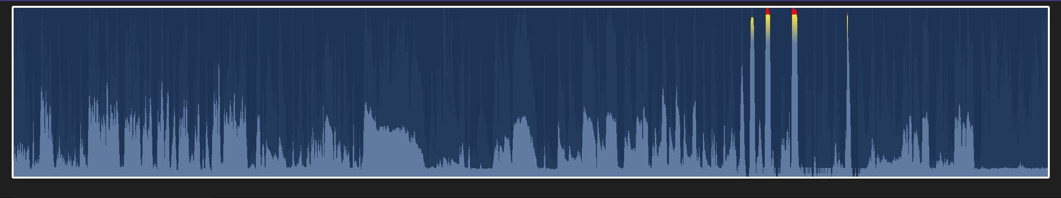 For example, the highest spikes in this recording represent the testing of a yell or loud phonation. They are yellow and then red near the tip and nearly reach the top of the recording box. Reaching the red area of a signal is a caution to the sound engineer (laryngologist) that they are reaching saturation of the digital recording and clipping of the signal. This means replaying the recording, the sound will not be truly representative of what was made by the patient.